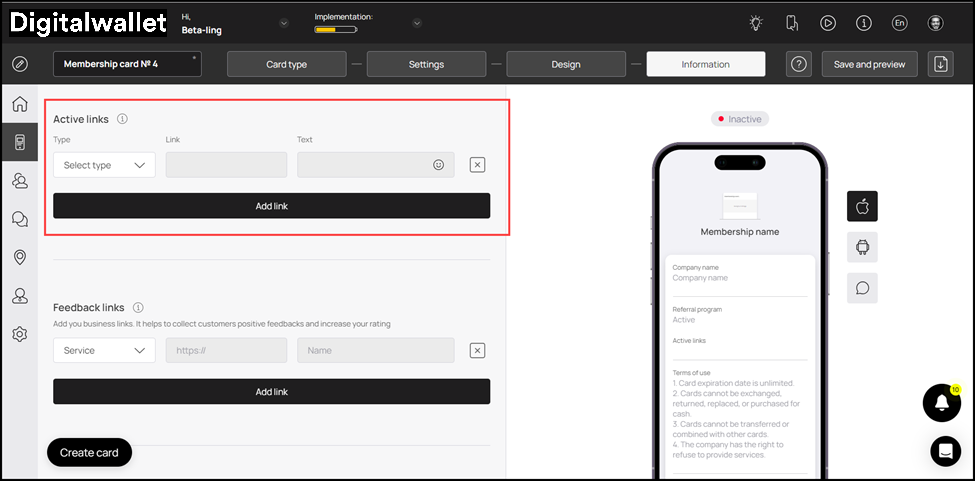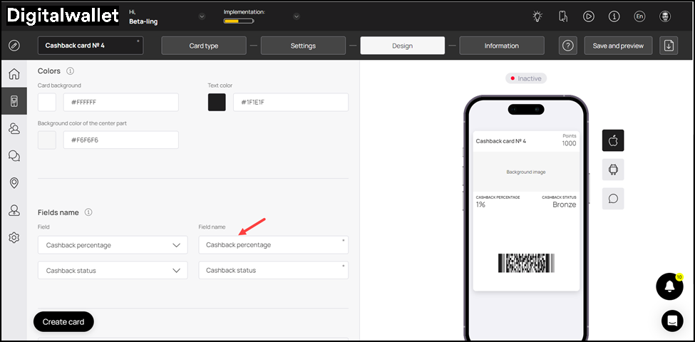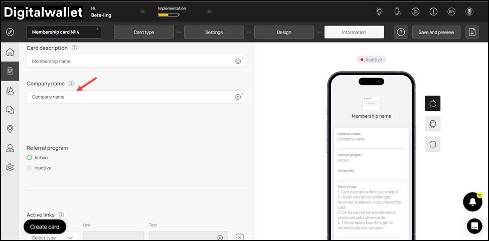1. This section lets you fill relevant information in the card. The impact of each field can be viewed in the mobile screen preview displayed on the right side of the screen.