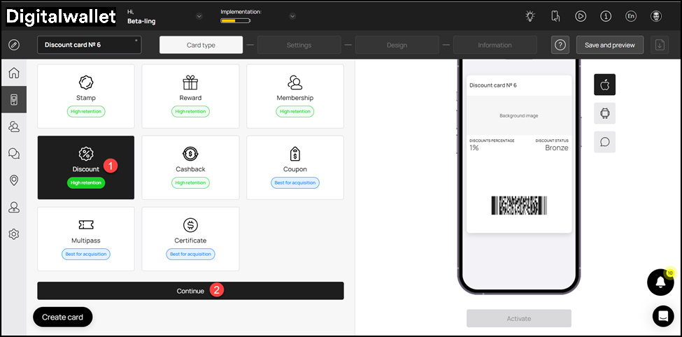 5. This initiates the stamp card creation workflow. A card is created by filling in the details in 5 sections that include Card Type, Settings, Design, Information, and Save and preview. Let us take a look at how each section works.
