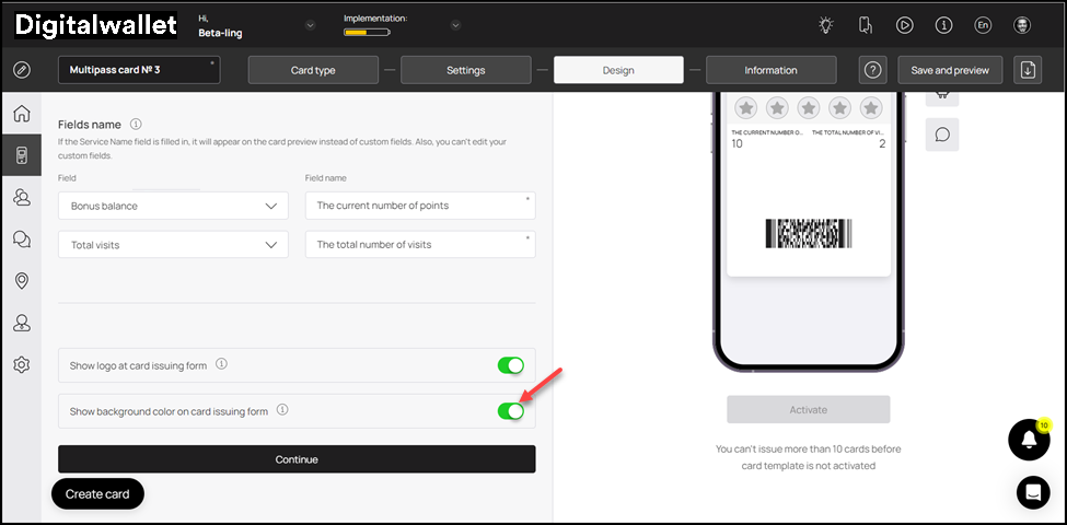 9. Similarly, enable the Show background color on card issuing form toggle button in case you want the background color to appear on the card issuing form.