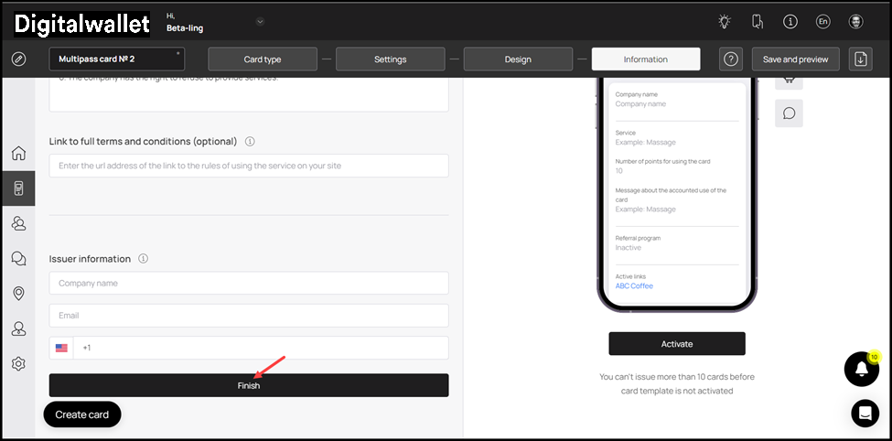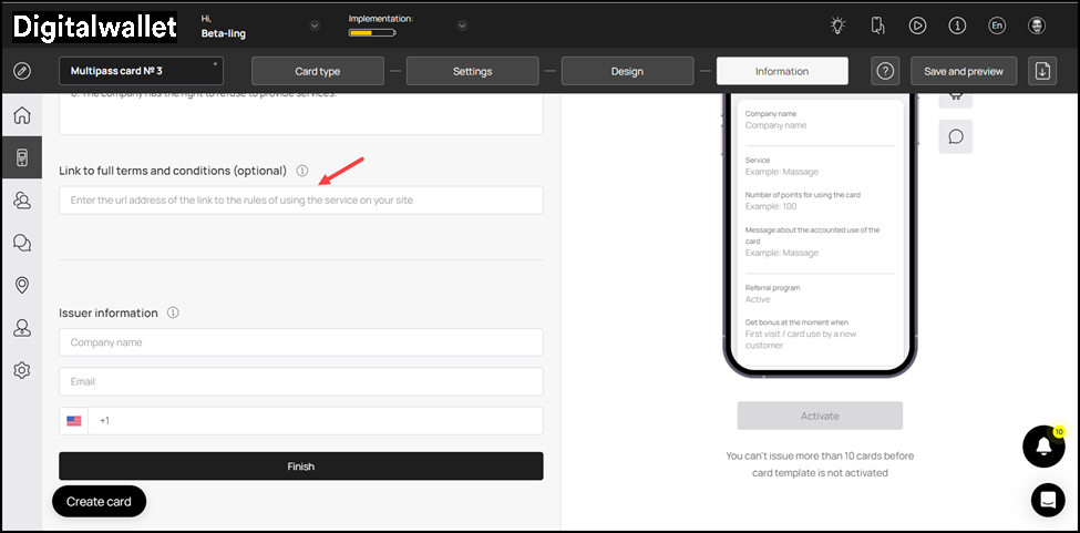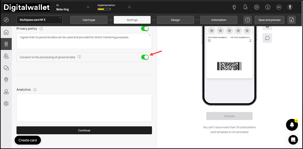 17. In case you want to include the privacy policy on the card, enable the toggle button next to the Privacy Policy heading. Moreover, you can also edit the privacy policy using the field below the heading.