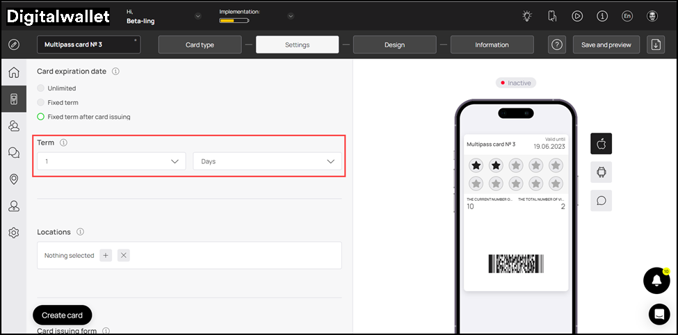 3. It is recommended to select Fixed term after card issuing from here. As this option is selected, the Term dropdowns are displayed. Here, you can select the number of days upon card activation after which it expires.