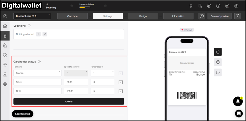 1. This section lets you configure the design of the discount card.