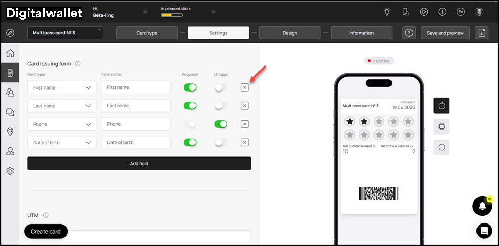 13. This is followed by the UTM field. Here, you can create a channel link for the analytics to be tracked of the traffic generated by that channel. For instance, if you add Facebook in this field, Digital Wallet will generate a URL automatically associated to a UTM tag.