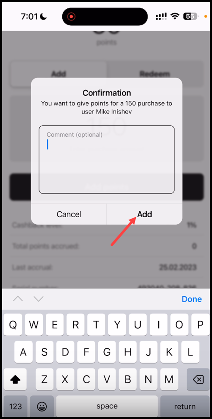 4. This opens the Confirmation popup. To confirm the points addition, click the Add button.