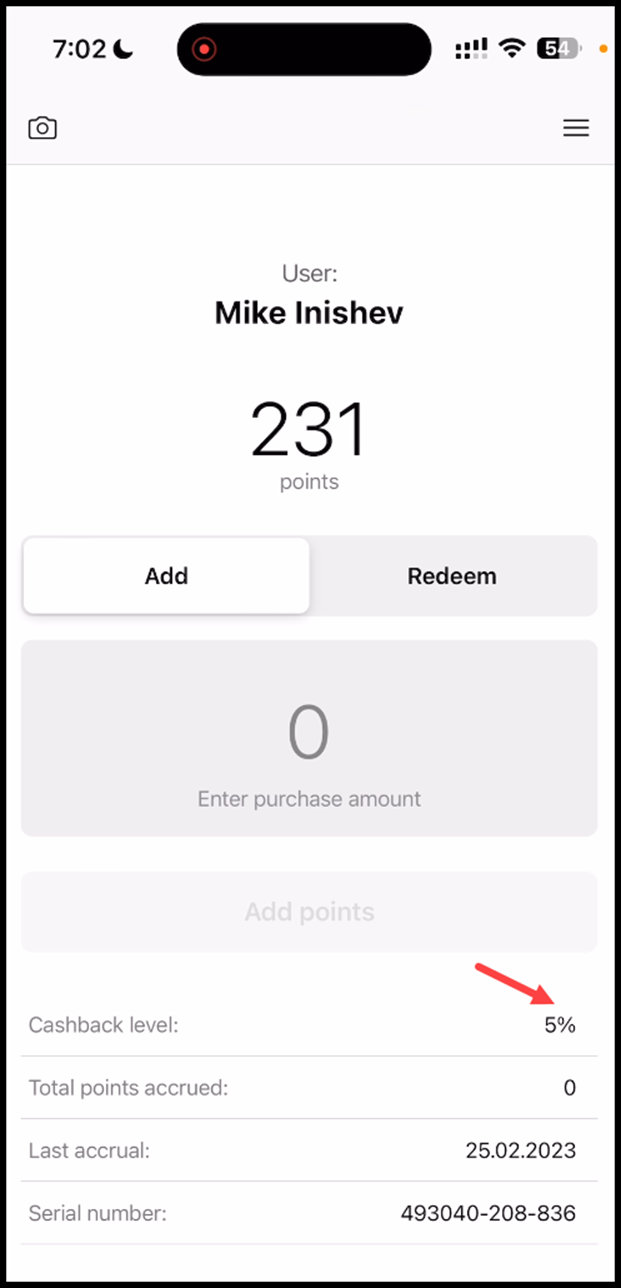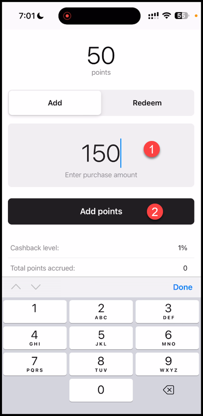 3. Upon successful scan, the cashback card is displayed in the scanner app. Use the Enter Purchase Amount field to enter the points you want to add. Once added, click the Add Points button.