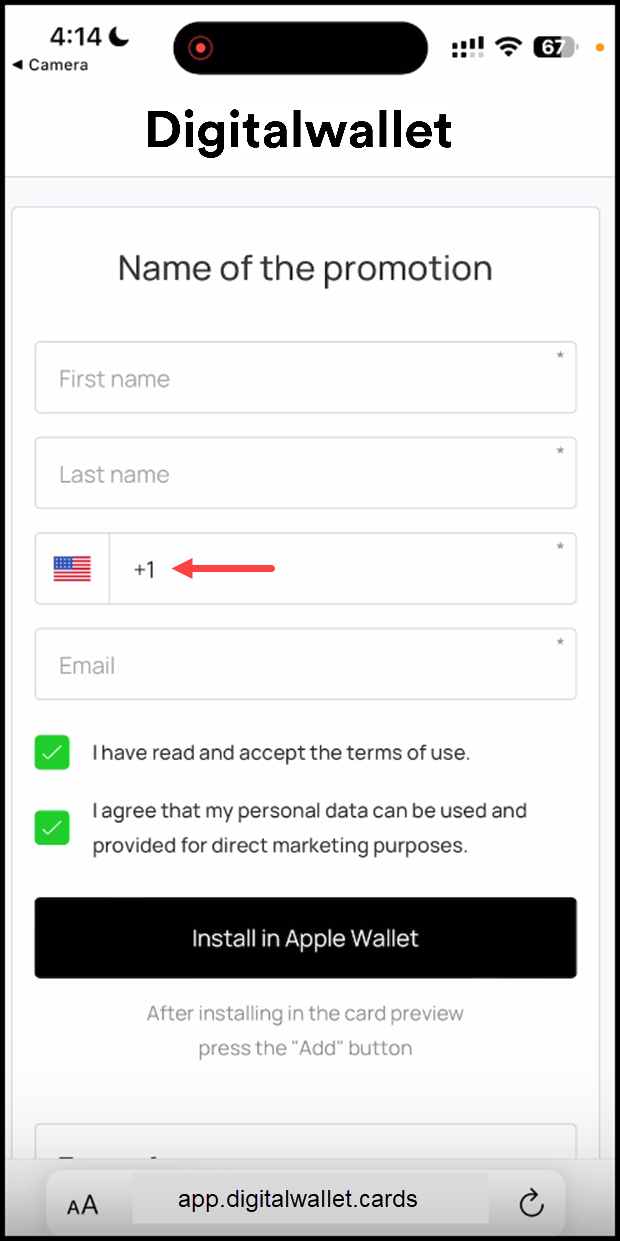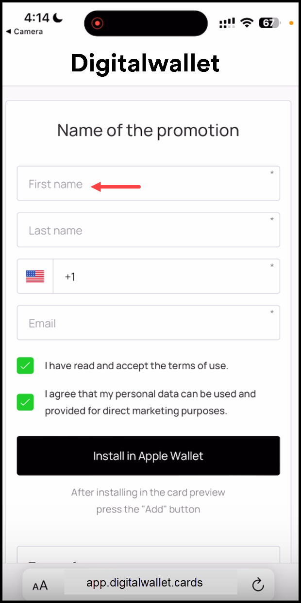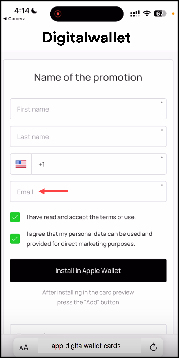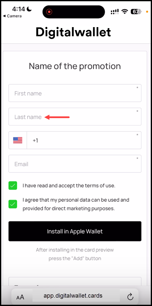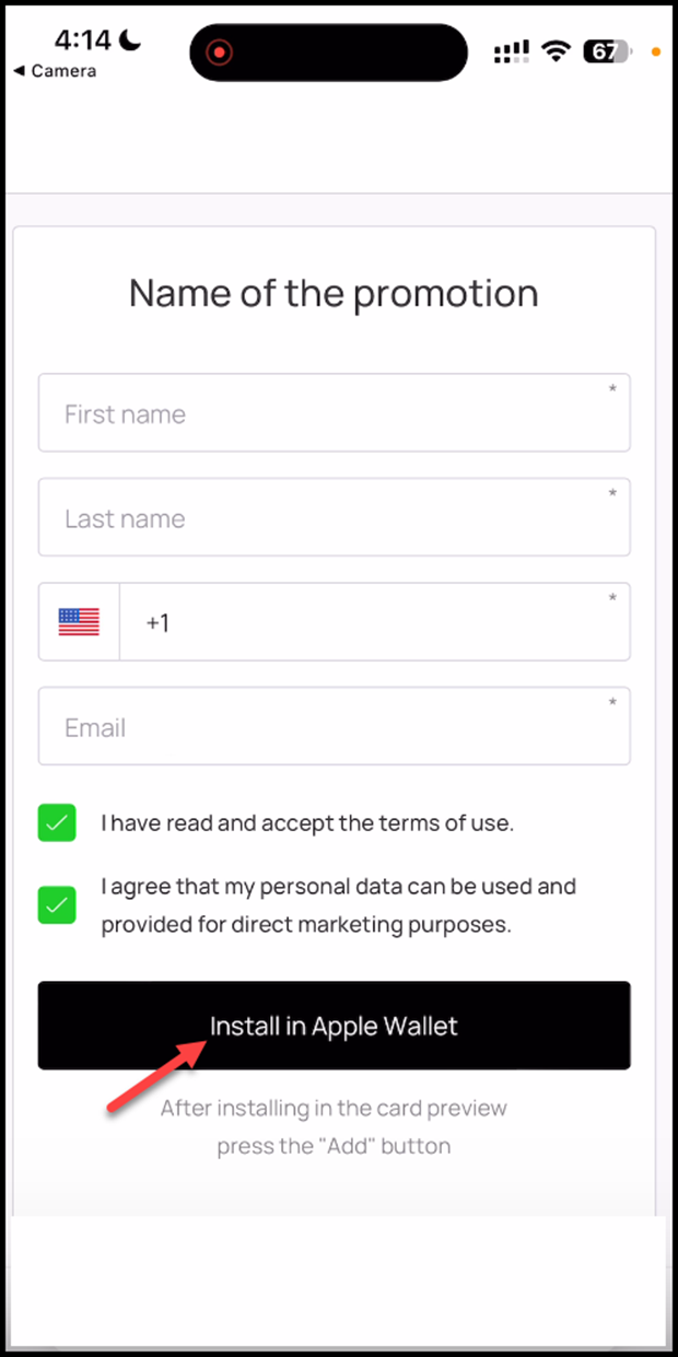 7. Once the required details are entered, click the Install in Apple Wallet button.