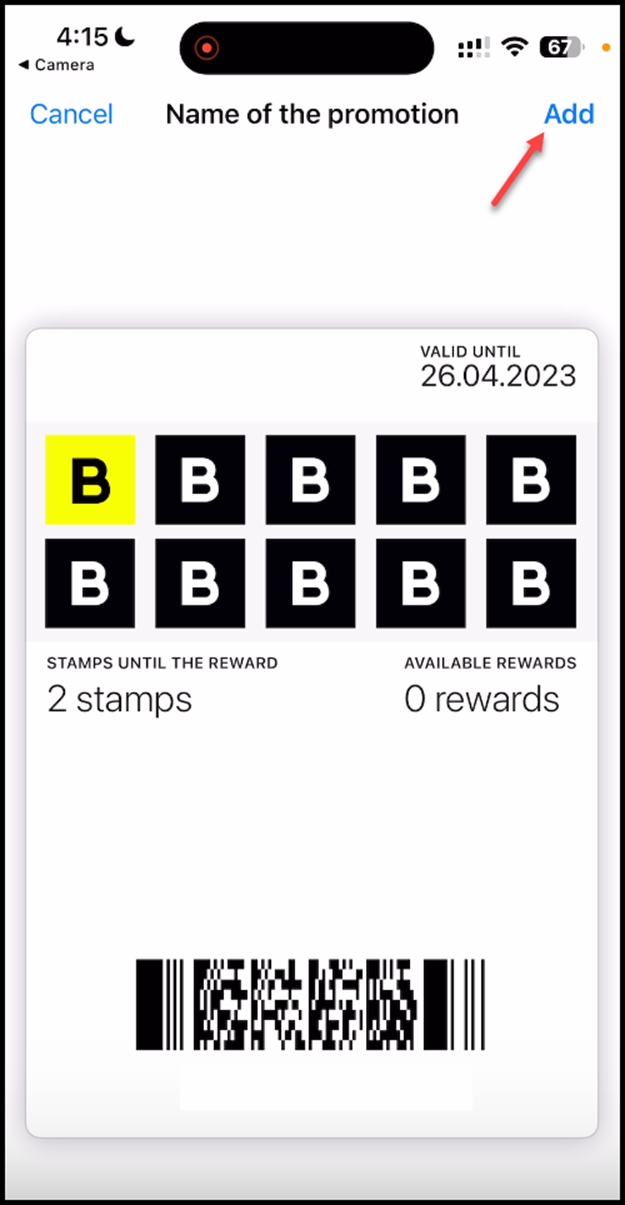 8. This loads the card in apple wallet. To add the card, click the Add button at the top-right corner of the screen.