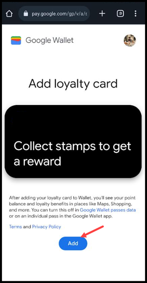 8. This loads the card in Google Wallet. To add the card to wallet, click the Add button.