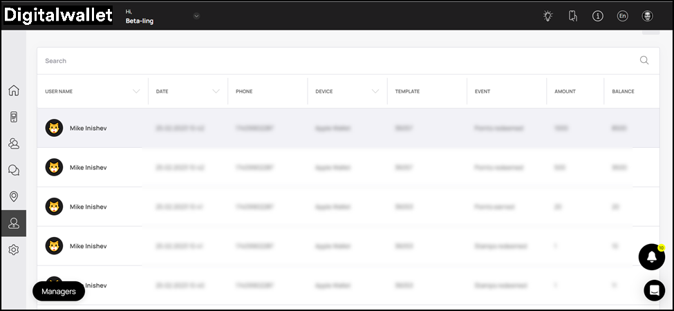7. At the end is the Last Transactions grid. Here, the last transactions of the manager are tabulated via several columns that include User Name, Date, Phone, Device, Template, Event, Amount, and Balance.